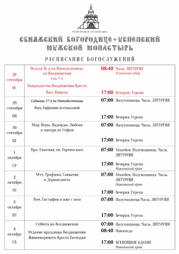Расписание богослужений в 17-ю седмицу по Пятидесятнице