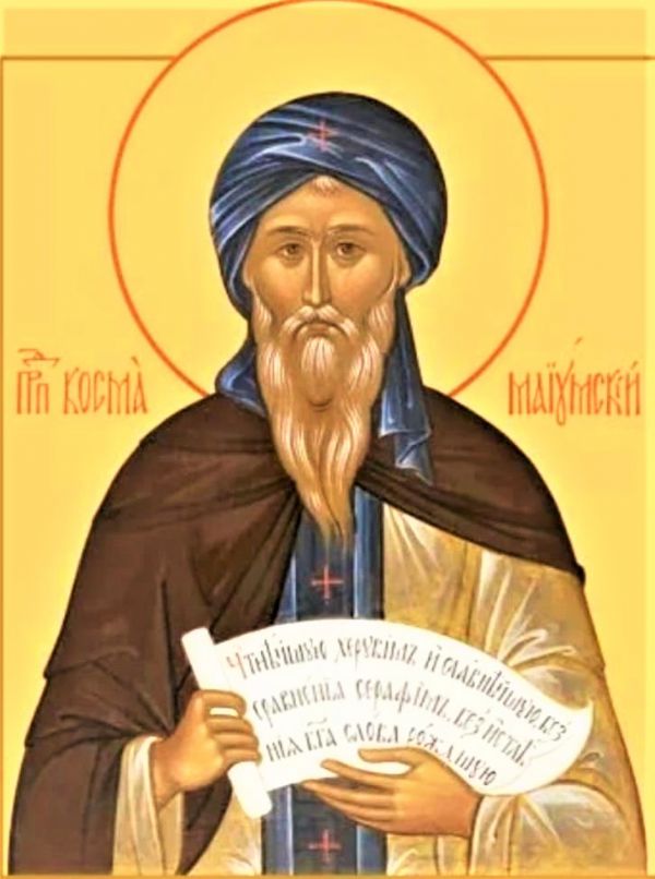 Преподобный Косма, епископ Маиумский, творец канонов, родился в Иерусалиме, воспитывался родителями преподобного Иоанна Дамаскина вместе с их сыном и получил прекрасное образование. Когда святой Косма достиг совершеннолетия, то поступил в одну из палестинских обителей, где прославился монашескими подвигами. Во время гонения на святые иконы преподобный Косма вместе с преподобным Иоанном выступил в защиту Православия. Они написали много сочинений против иконоборцев. В 743 году Косма был поставлен епископом Маиумским. Преставился он в глубокой старости, около 787 года, оставив после себя много канонов на праздничные дни и трипеснцы (неполные каноны, состоящие из трех песен) на четыре дня Страстной седмицы.