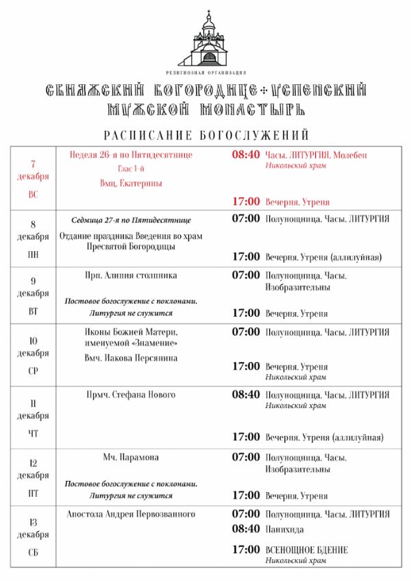 Расписание богослужений в 27-ю седмицу по Пятидесятнице