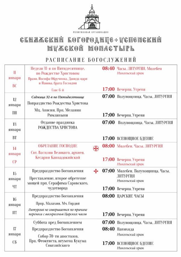 В среду 14 января, в праздник Обрезания Господня, богослужение начнется в 8:00 пением братского молебна Пресвятой Богородице. Служба на праздник будет совершаться в Германовском храме.