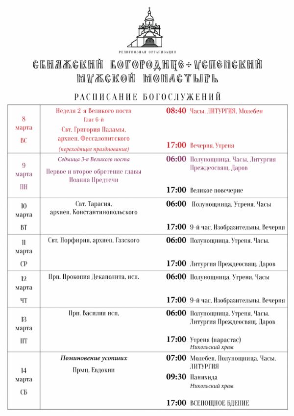 Расписание богослужений 8—14 марта