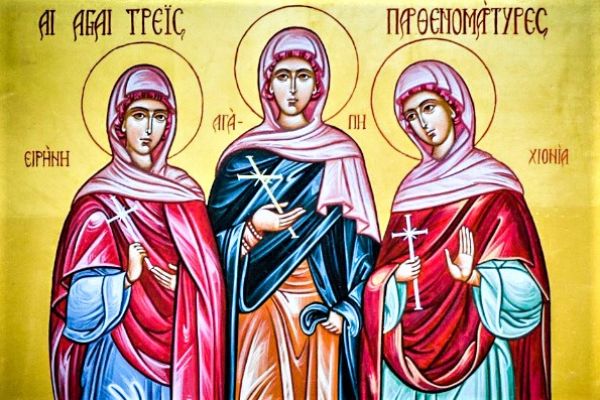 Святые мученицы Агапия, Ирина и Хиония были родными сестрами и жили в конце III – начале IV века вблизи итальянского города Аквилеи. Они остались сиротами в юном возрасте. Девушки вели благочестивую христианскую жизнь и отклоняли домогательства многочисленных женихов.