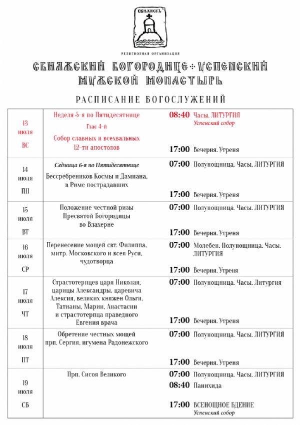 Расписание богослужений в седмицу 6-ю по Пятидесятнице