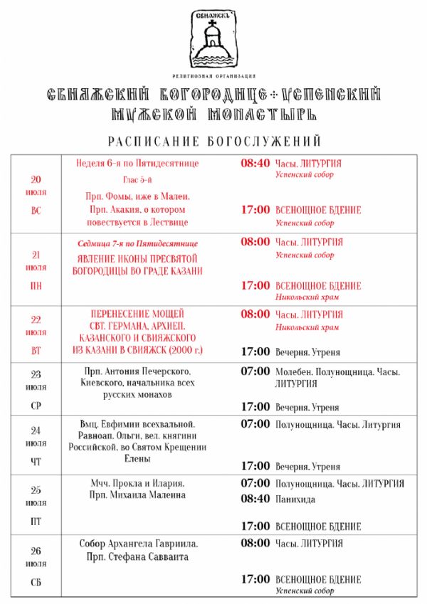Расписание богослужений 20-26 июля