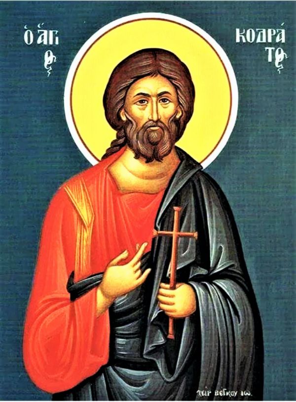 Святой Кодрат, предположительно, родился во второй половине I века, был епископом Афинским. Проповедовал слово Божие в Афинах и Магнезии, в восточной части полуострова Фессалии, что в Греции. Многих язычников святой обратил к истинной вере во Христа Спасителя. Его проповедь вызвала ненависть закоренелых язычников. Однажды разъяренная толпа напала на апостола, чтобы побить его камнями. Хранимый Богом Кодрат остался жив, тогда его бросили в темницу, где он и скончался от голода. Святое тело его было погребено в Магнезии. Апостол Кодрат оставил после себя написанную в защиту христианства апологию. В настоящее время из апологии известна только часть, процитированная историком Евсевием в IV веке: «Дела Спасителя нашего всегда были очевидны, потому что были истинны. Исцеленные Им и воскрешенные из мертвых были видимы не только, когда исцелились и воскресли, но и всегда. Они жили не только в пребывание Спасителя на земле, но довольно долго оставались в живых и по Его отшествии; некоторые же дожили и до нашего времени».