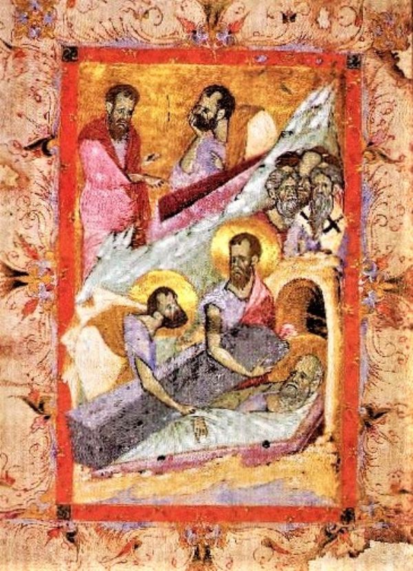 Когда апостолу Иоанну было более ста лет, Господь открыл ему, что дни его земной жизни сочтены. Апостол вышел из дома рано утром, до рассвета, позвал семерых учеников, среди которых был и апостол Прохор, верный его ученик и спутник, и попросил их следовать за ним, захватив с собой лопаты. Он привел их в одно место за городом и уединился для молитвы. Окончив молитву, сказал: «Копайте вашими лопатами могилу в форме креста в длину моего роста». Потом снова помолился и лег в могилу, после чего обратился к Прохору: «Прохор, сынок, ты должен идти в Иерусалим, где и закончится твоя жизнь». Обняв учеников, он сказал: «Возьмите земли, матерь мою землю, и укройте меня». Они покрыли его землей до колен, и он умолял их продолжать и закопать его по шею. После этого произнес: «Принесите тонкий покров и положите мне на лицо, и попрощайтесь со мной в последний раз, ибо в этой жизни уже не увидите меня». Он отослал их, благословив, а они оплакивали своего возлюбленного отца и учителя.