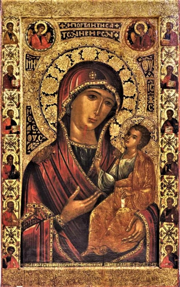 Иверская икона (которая сейчас хранится на Афоне) в IX веке находилась у одной благочестивой вдовы, жившей близ города Никеи. При императоре Феофиле (829–842) иконоборцы, уничтожавшие святые иконы, пришли в дом этой христианки, и один воин копьем ударил по образу Богородицы. Тотчас из пораженного места потекла кровь. Вдова, боясь уничтожения святыни, пообещала императорским воинам деньги и просила их до утра не трогать икону. Когда они ушли, женщина вместе с сыном (впоследствии афонским иноком) для сохранения святой иконы опустила ее в море. Икона, стоя на воде, приплыла к Афону. Афонские иноки, несколько дней видя в море огненный столп, восходящий до неба, пришли к берегу и нашли святой образ, стоящий на воде. После молебна о даровании монастырю явившейся святыни благочестивый инок Иверского монастыря святой Гавриил Грузин (память 25 июля), по повелению Божией Матери, явившейся ему во сне, пошел по воде, принял святую икону и поставил в храме. Однако на следующий день икона была обретена не в храме, а над воротами обители. Так повторялось несколько раз, пока Пресвятая Дева не открыла святому Гавриилу Свою волю во сне, сказав, что не желает быть хранимой иноками, а хочет быть их Хранительницей. После этого образ был поставлен над монастырскими воротами, где находится и по сей день. Поэтому святая икона называется еще Портаитиссою, Вратарницею.
