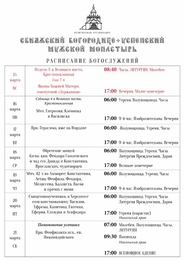 Расписание богослужений 15—21 марта