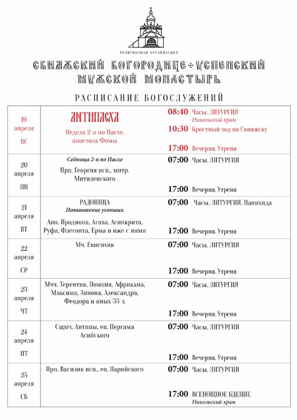 Расписание богослужений 19—25 апреля